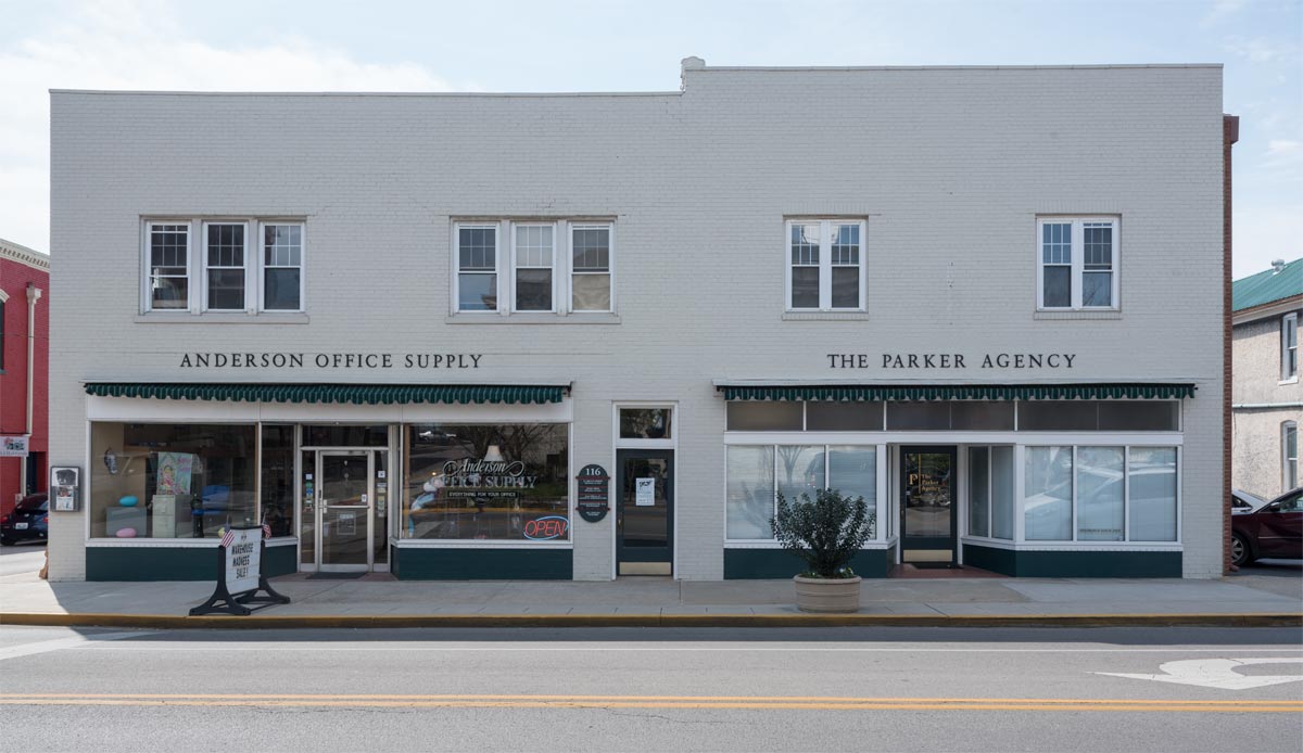 And here is what our building looks like today. Orwin Law offices are upstairs from the entrance between Anderson Office Supply and The Parker Agency.